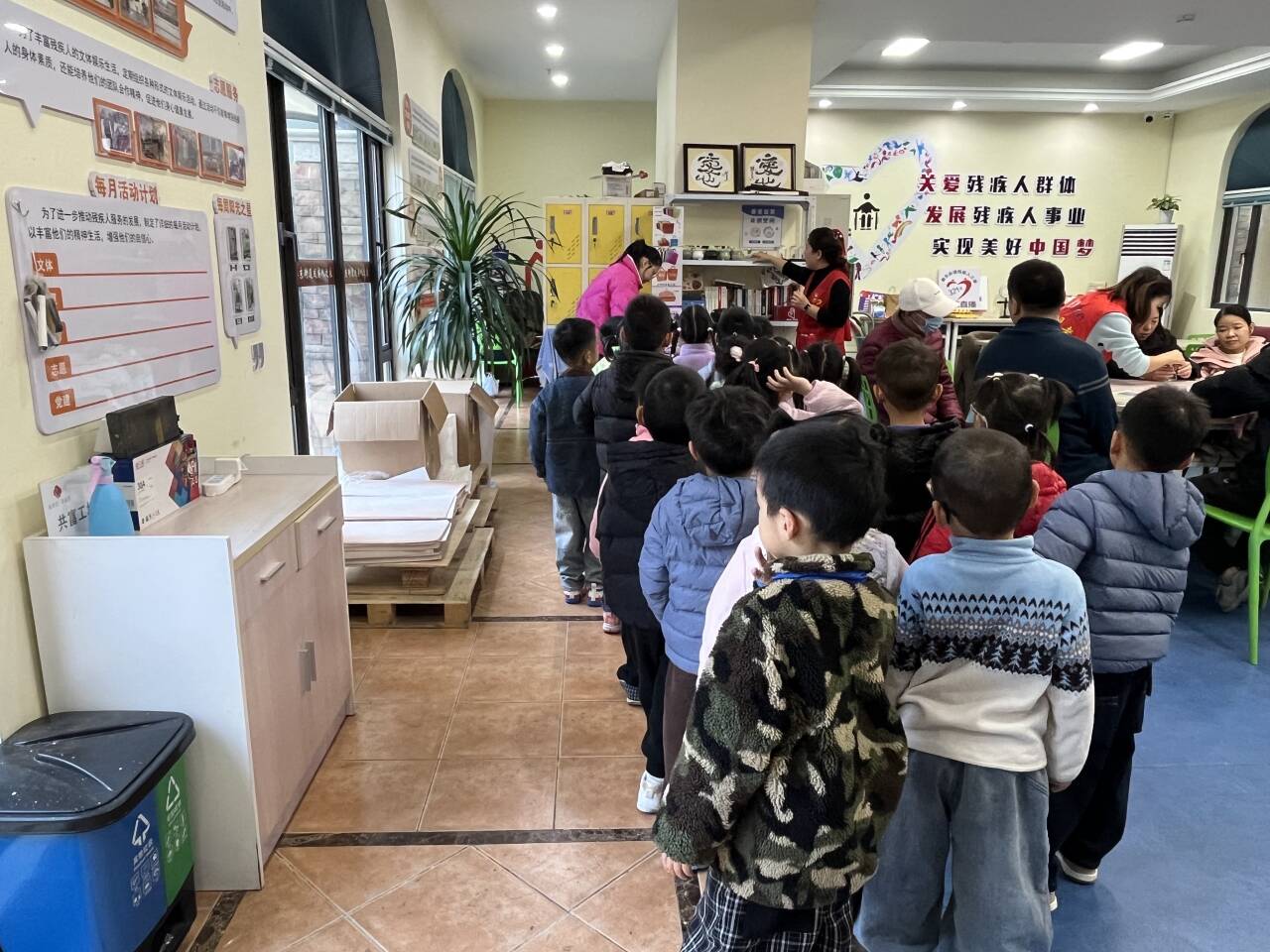 活动中,孩子们在老师的带领下有序排队,步行前往太仓市景瑞社区。在社区工作人员的引导下,大家先后参观了老年人日照中心、残疾人活动中心、社区法律调解室、儿童活动室、老年人活动中心及社区图书馆等多个功能区域,详细了解了各专项活动室的服务内容与开放时间。参观过程中,孩子们欣赏了社区老年人的舞蹈排练与乐器演奏,观看了残疾人朋友的手工制作过程,还学习了“你好”“谢谢”等简单的手语表达。
