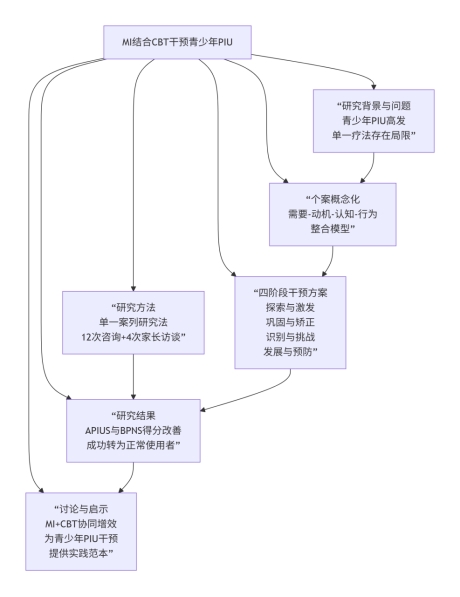 (一) 研究背景与理论基础 现实问题: 青少年是问题性网络使用的高发人群,其身心健康与未来发展受到严重威胁。 传统的认知行为疗法虽为主流,但常因青少年改变动机不足而效果受限。 理论瓶颈与整合契机: 认知行为疗法:强调通过改变非适应性认知来矫正问题行为,但前提是来访者有改变的意愿。 动机式访谈:以来访者为中心,通过满足其自主、关系、能力三大基本心理需要,从内部激发改变动机。 理论整合:研究发现,MI可作为CBT的“前奏”,先解决动机问题,再通过CBT高效矫正行为,二者形成互补。 (二) 个案概况与评估诊断 个案基本情况:来访者Z,17岁高三女生,因学业压力大、亲子关系紧张而沉迷网络,形成“负面情绪-上网-更负面情绪”的恶性循环。 心理评估: 前测结果:问题性网络使用量表得分为3.89,判定为“问题性网络使用者”;基本心理需要量表得分为3.42,满足程度低。 诊断:未达到网络游戏障碍诊断标准,但问题性网络使用问题明确,在咨询师胜任力范围内。 (三) 个案概念化:构建整合干预模型 本研究构建了一个核心的整合概念模型,用以指导干预: 基本心理需要匮乏 (现实生活缺失) ↓ 寻求网络替代满足 & 产生非适应性认知 (如“我一无是处”) ↓ 问题性网络使用行为 & 改变动机不足 ↓ 干预路径:MI (满足需要,激发动机) → CBT (矫正认知,改变行为) (四) 四阶段整合干预方案与过程 整个干预历时12次,分为四个清晰的阶段,MI与CBT技术灵活贯穿其中: 第一阶段:探索与激发 (第1-3次,以MI为主) 目标:建立关系,探索价值观与矛盾,激发改变动机。 技术:开放式提问、菜单法(赋予自主权)、肯定与共情。 第二阶段:巩固与矫正 (第4-6次,MI向CBT过渡) 目标:巩固动机,开始行为矫正。 关键事件:咨询师灵活处理来访者的突发焦虑,巩固了咨询关系。 技术:功能分析、合作制定时间管理计划、引入家长支持。 第三阶段:识别与挑战 (第7-9次,以CBT为主) 目标:识别并挑战非适应性认知,处理阻抗。 技术:心理教育、认知三角、苏格拉底式提问、箭头向下技术(探索核心信念)。 处理阻抗:当来访者出现犹豫时,咨询师巧妙切换回MI,运用“转折共识”技术再次激发动机。 第四阶段:发展与预防 (第10-12次) 目标:预防复发,巩固成果,发展健康替代方式。 技术:回顾总结、心理教育(区分“失误”与“复发”)、预设困难情境模拟。 家长工作:平行进行4次家长访谈,引导父母理解孩子心理需要,从控制转向支持,共同创建“自主性支持”的家庭环境。 (五) 干预效果评估 定量评估: 问题性网络使用 (APIUS):得分从3.89(问题性使用者)显著降至2.76(正常使用者),且一个月后随访效果稳定。 基本心理需要 (BPNS):得分从3.42(低水平)显著上升至5.47(高水平)。 定性评估: 来访者自评:网络使用有节制,认知灵活性增强,能在现实生活中满足心理需要。 家长反馈:女儿用网时间减少,情绪稳定,亲子沟通改善。 研究者观察:来访者发展了健康的生活方式(如跑步、烘焙),对未来充满信心。 (六) 讨论、结论与启示 核心结论:MI与CBT的整合模式对本案例中的青少年问题性网络使用干预取得了显著且持久的效果,实现了从“问题性使用者”到“正常使用者”的转变。 协同机制: MI先行,解决了青少年改变动机不足的核心难点,为后续干预铺平道路。 CBT跟进,提供了具体、结构化的问题解决工具。 两者结合,实现了 “标本兼治” :既减少了外显的问题行为,又提升了内在的心理需要满足度,符合 “来访者利益最大化” 原则。 成功关键:个性化的干预方案、稳固的咨询关系、咨询师的灵活性,以及家庭系统的有效配合。 实践价值:本研究为我国青少年问题性网络使用的干预提供了一个可复制的、行之有效的整合干预范本,具有重要的临床参考与推广价值。 |